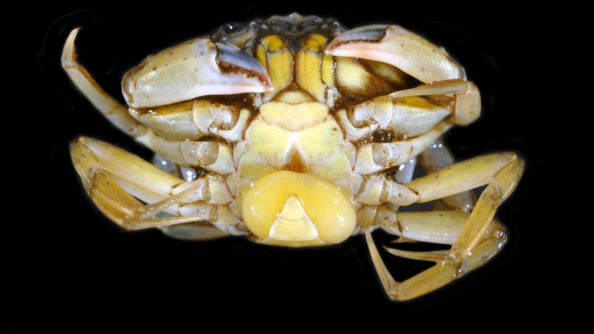 Shorecrab (Carcinus maenas) with a yellow egg sack of the parasite (Sacculina carini). Photo: Hans Witte, NIOZ