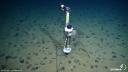 Sensor frame deployed among the polymetallic nodules in the Clarion-Clipperton Zone in the NE equatorial Pacific Ocean. The top sensor is a turbidity sensor recording suspended particulate matter loads and the bottom vertically mounted sensor is an ADCP (Acoustic Doppler Current Profiler) used for recording current speed and direction, as well as vertical profiles of turbidity. Photo taken by ROV KIEL 6000 (GEOMAR, Kiel).