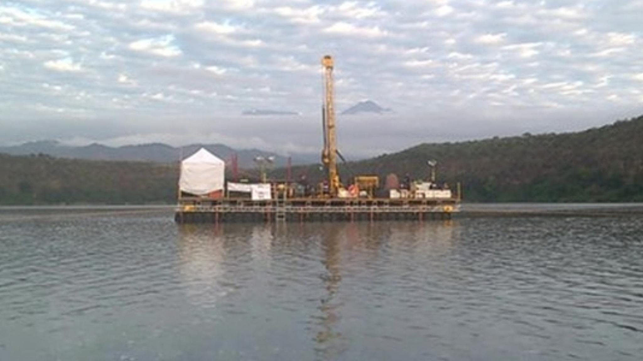 Drilling platform of the DeepCHALLA project on Lake Chala in East Africa, with the peaks of Mount Kilimanjaro in the background. Photo: Dirk Verschuren.